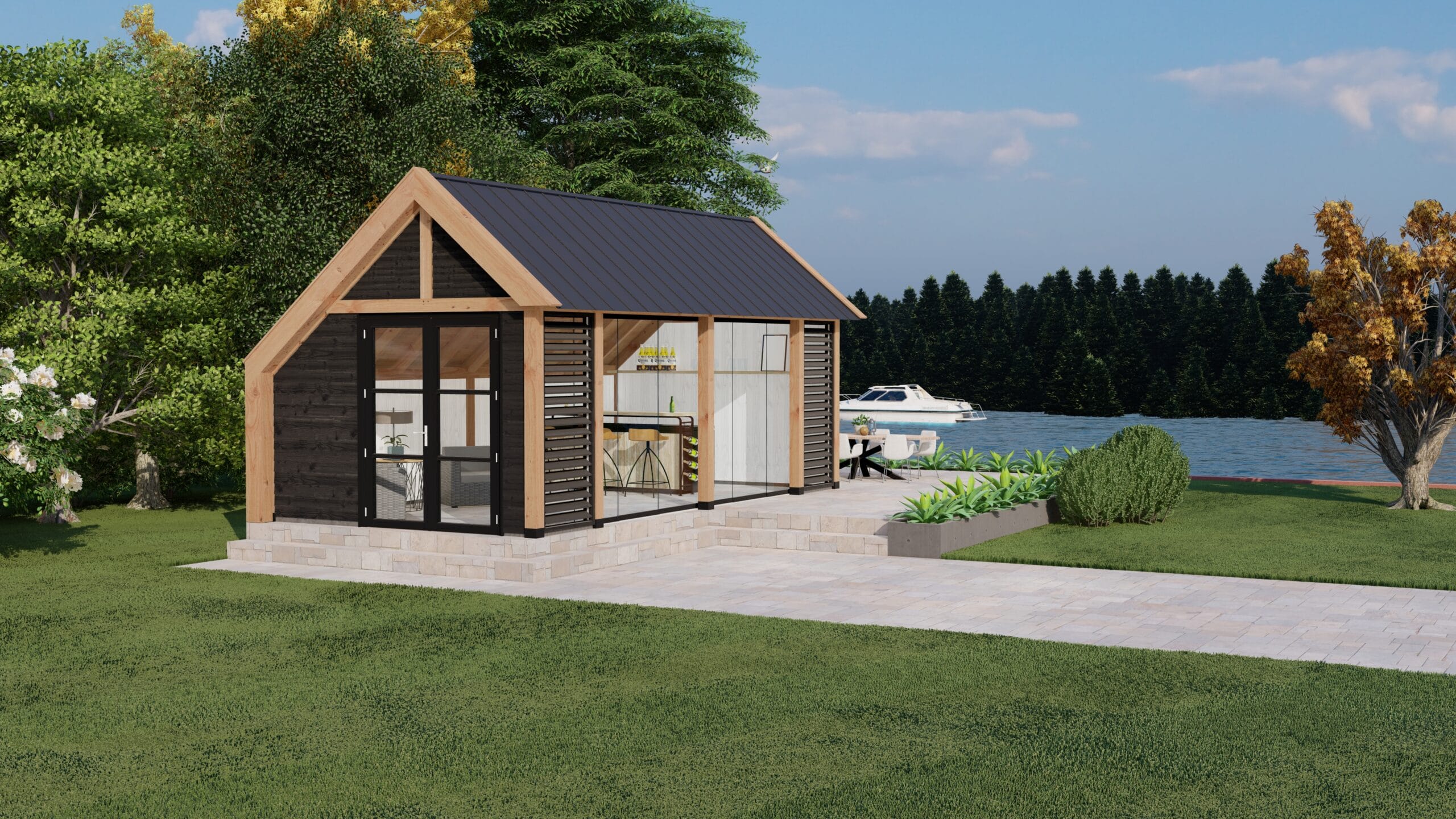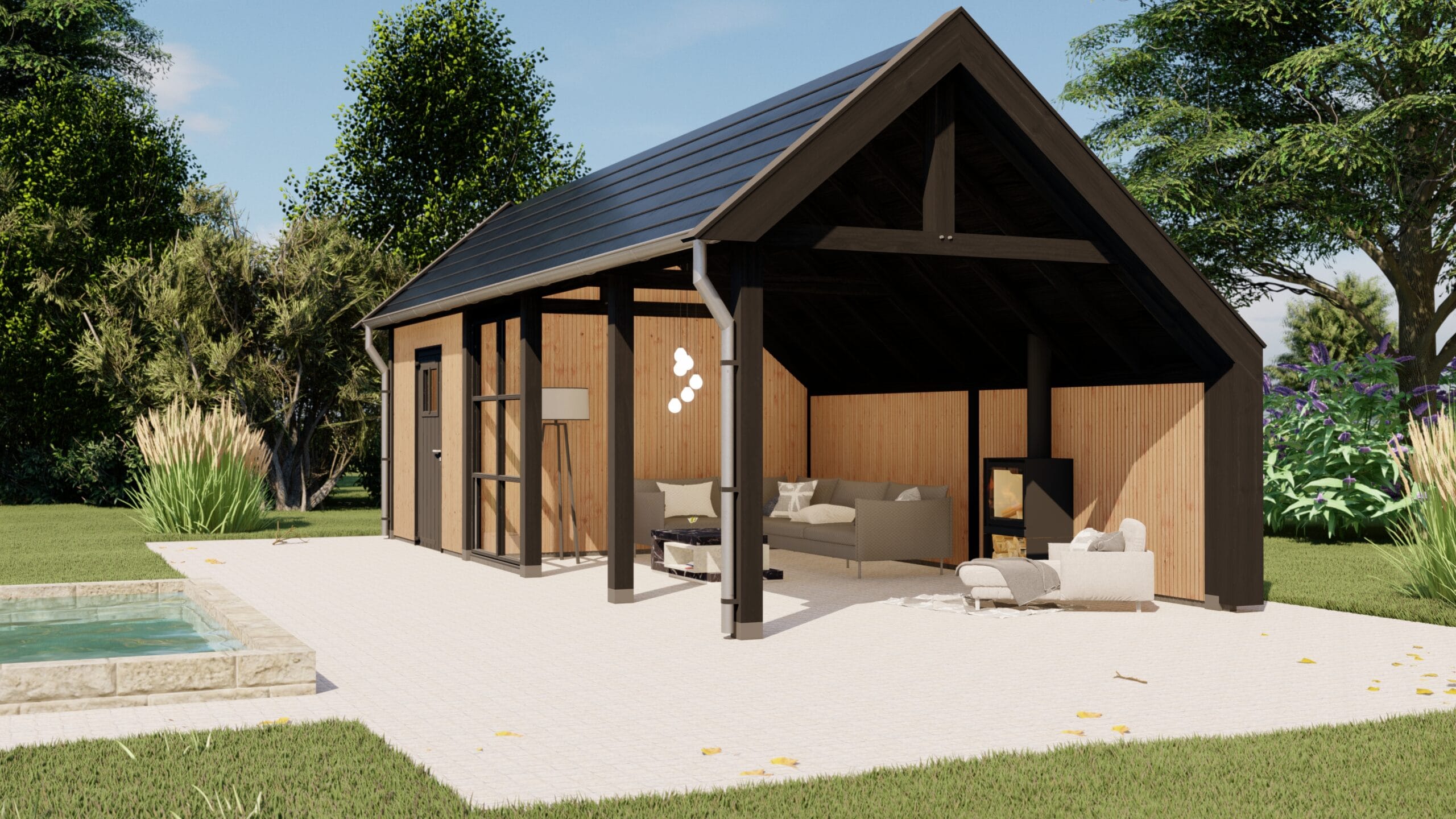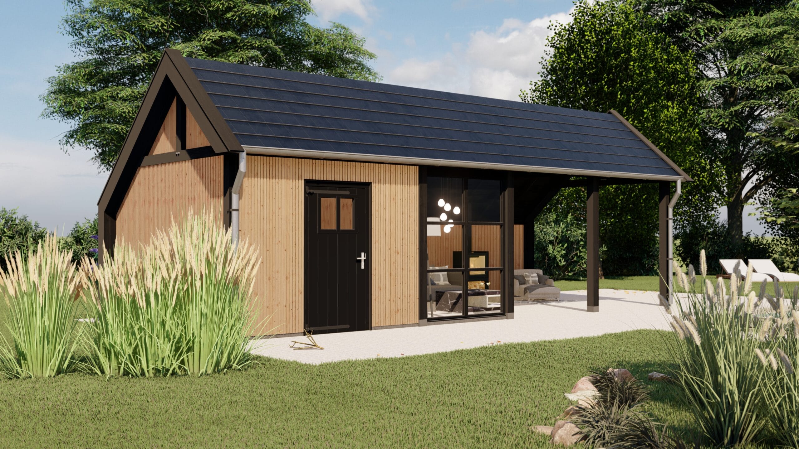 Buitenverblijf Lissabon is een moderne aanvulling voor je tuin of buitenruimte. Ideaal als tuinkantoor, tuinkamer, poolhouse of B&B. Dit buitenverblijf past perfect in zowel landelijke als luxe omgevingen. De strak ontworpen kolommen aan de zijkanten dragen bij aan een elegante en verfijnde uitstraling.