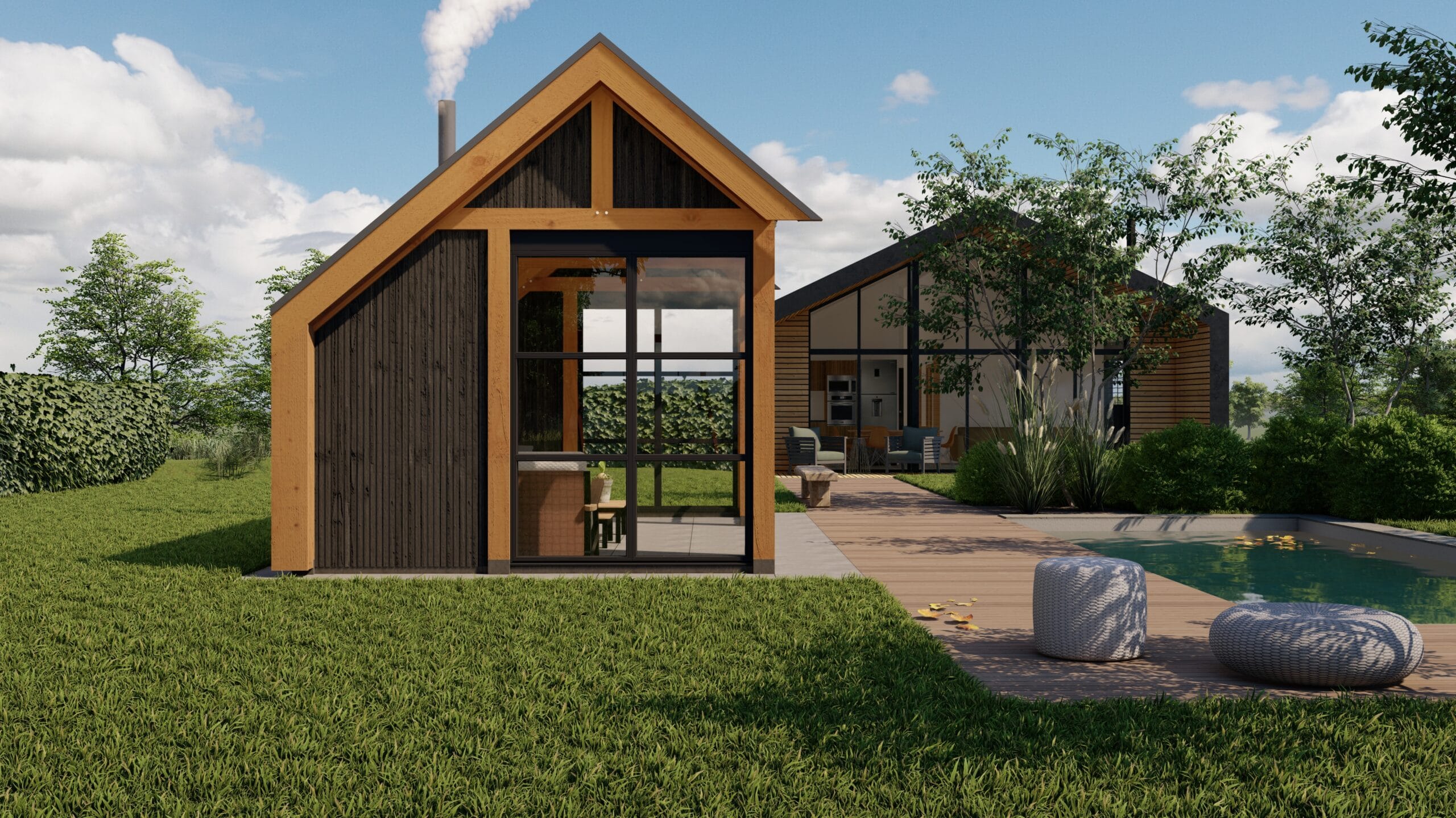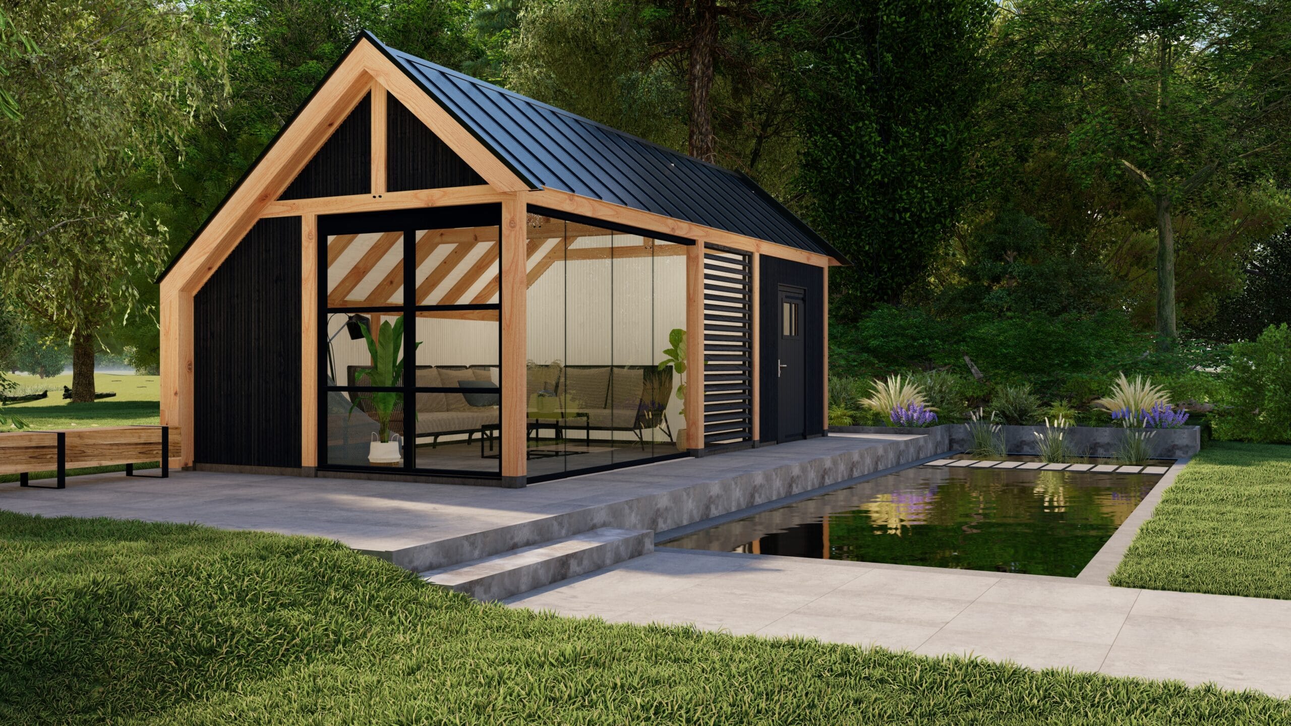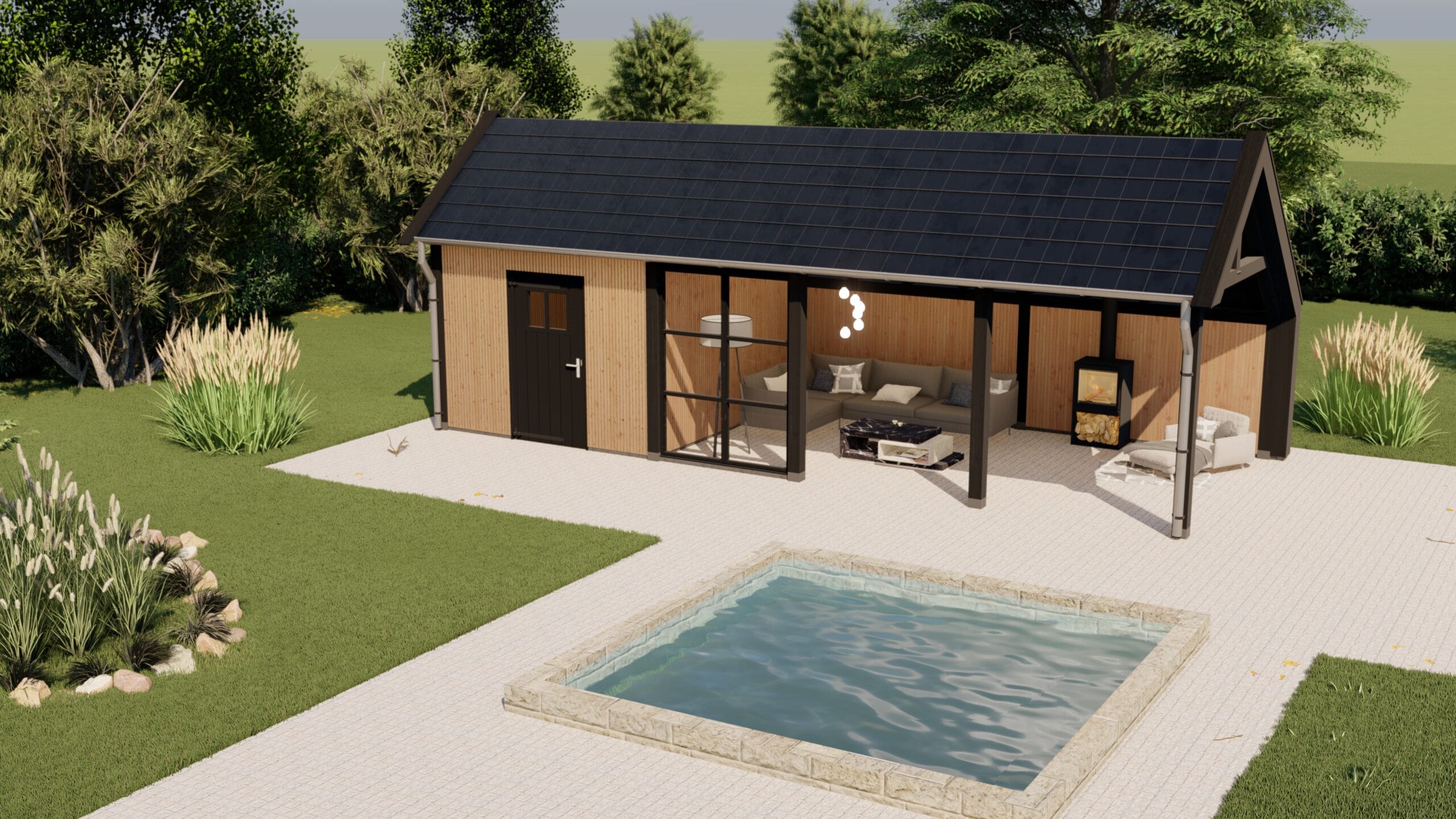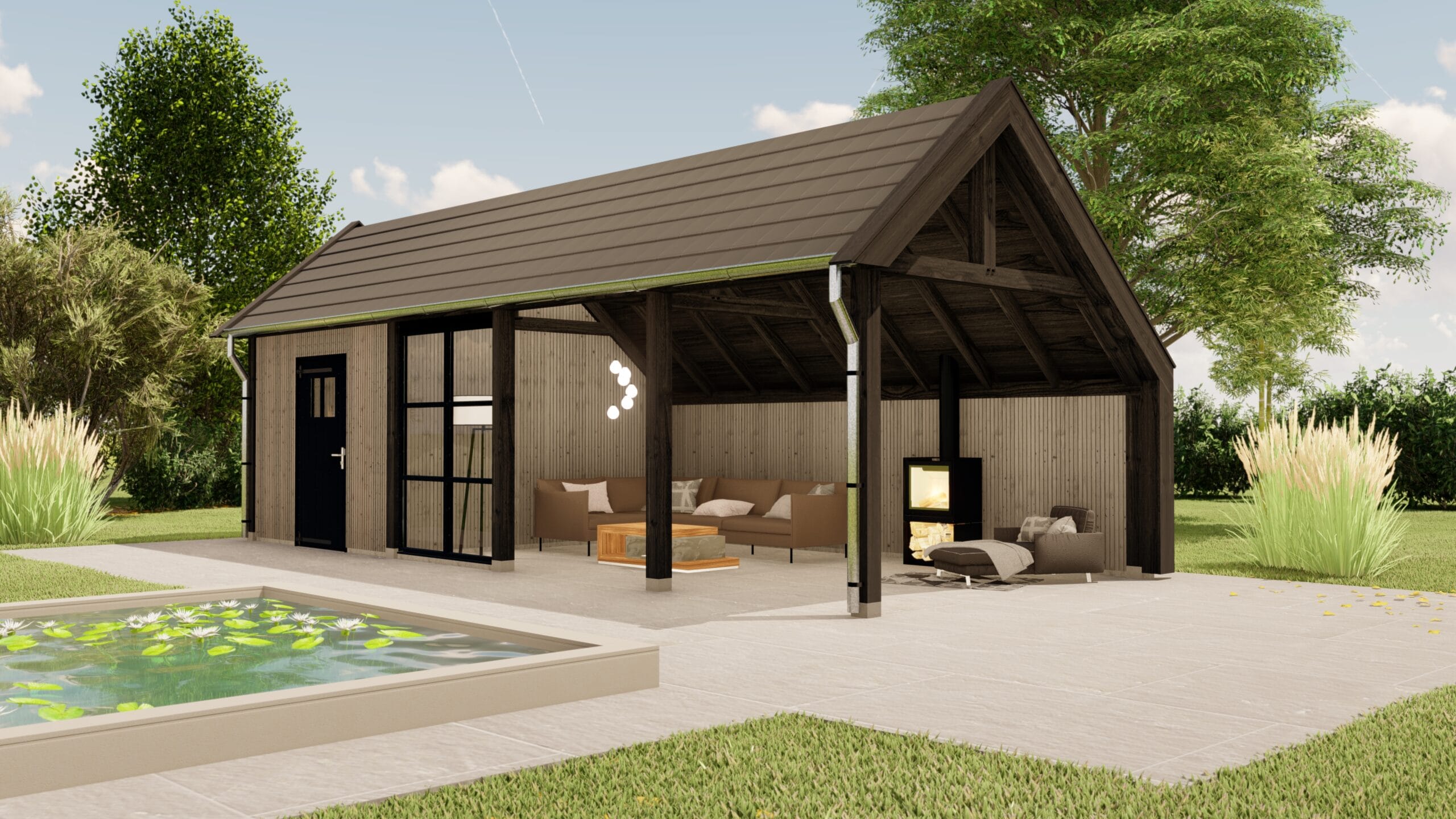 Buitenverblijf Lissabon is een moderne aanvulling voor je tuin of buitenruimte. Ideaal als tuinkantoor, tuinkamer, poolhouse of B&B. Dit buitenverblijf past perfect in zowel landelijke als luxe omgevingen. De strak ontworpen kolommen aan de zijkanten dragen bij aan een elegante en verfijnde uitstraling.