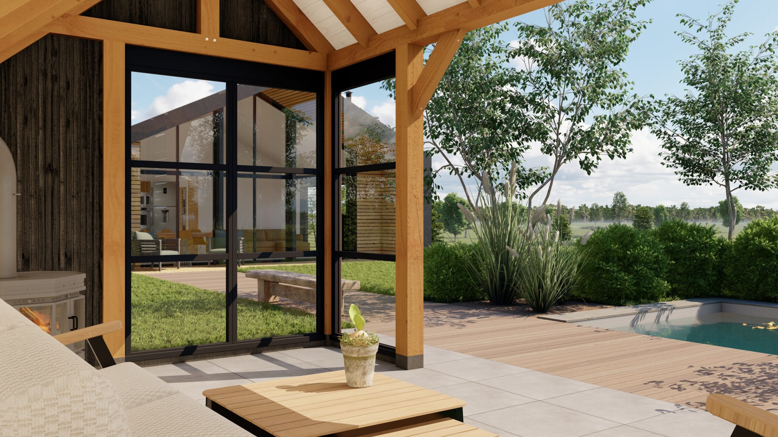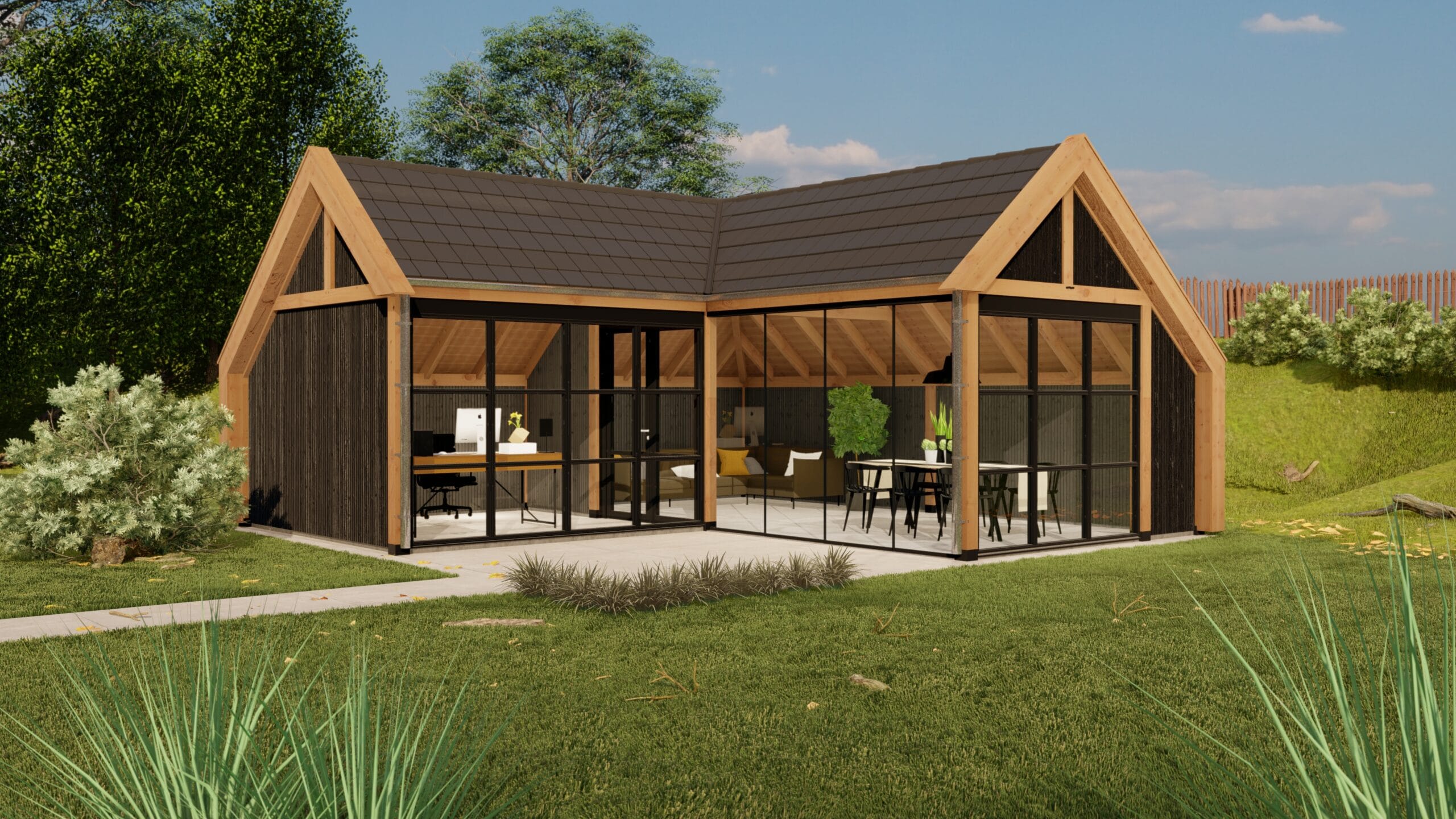 De kapschuur biedt de mogelijkheid om naar wens te worden aangepast, door te combineren met onder anderen dakbedekking, en ons uitgebreide ramen en deuren assortiment.