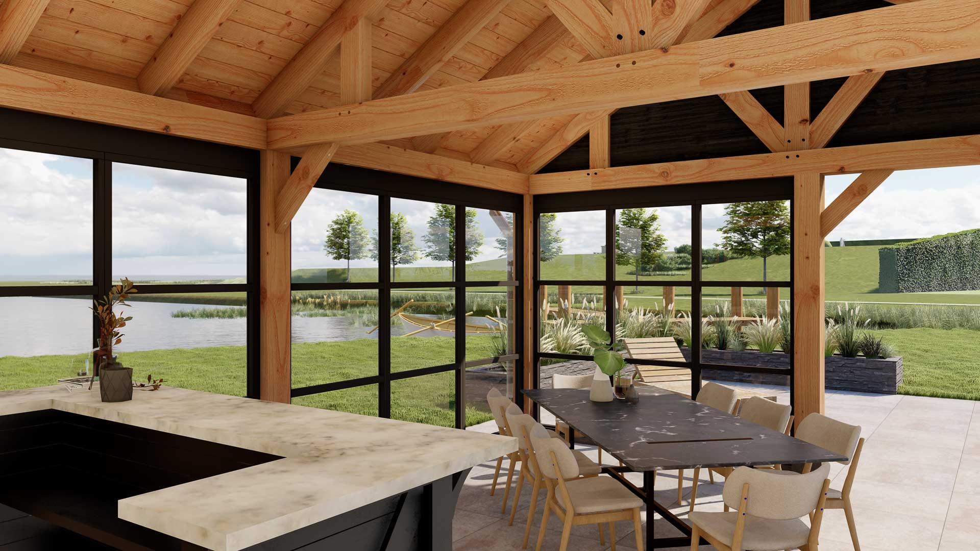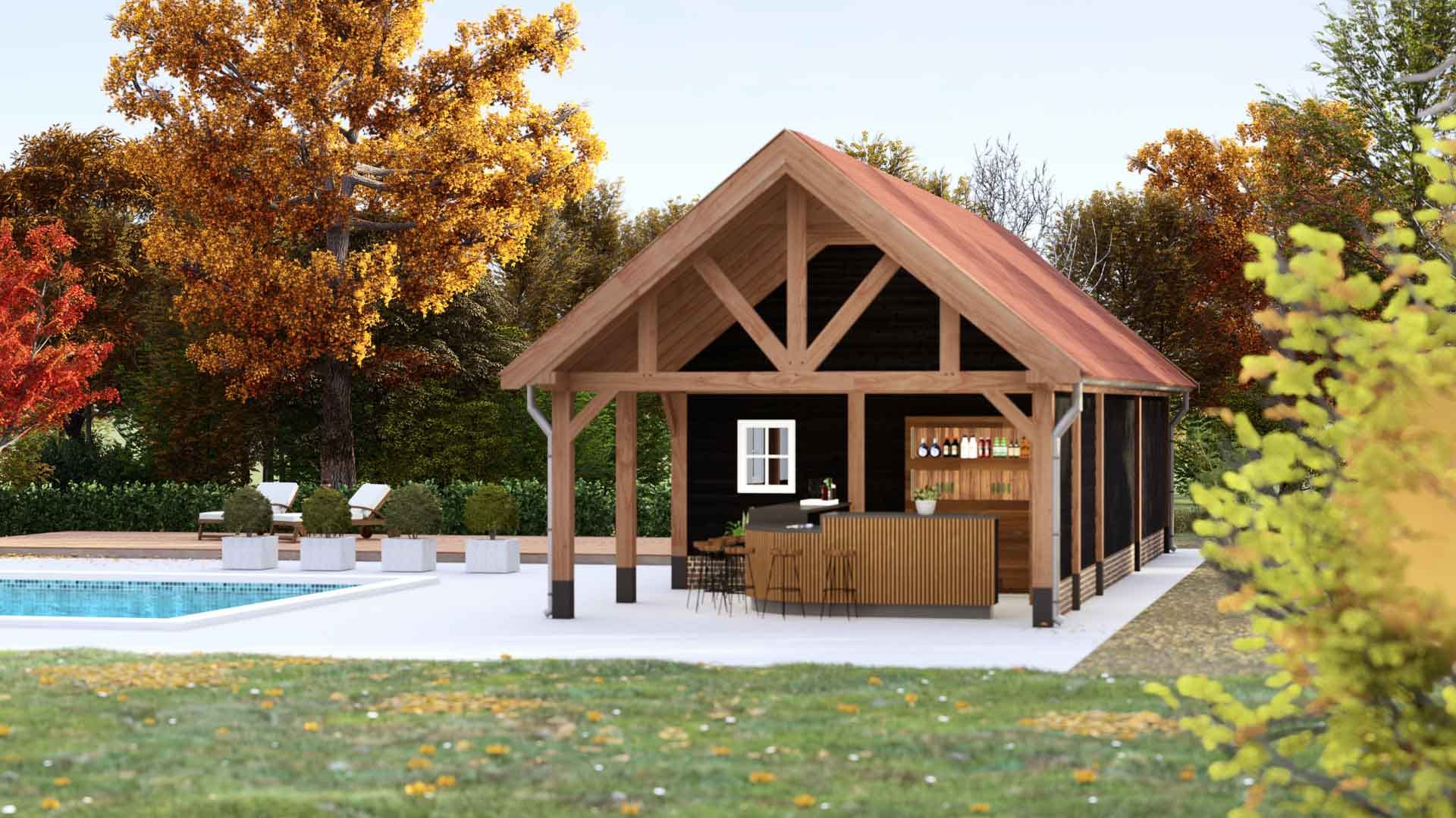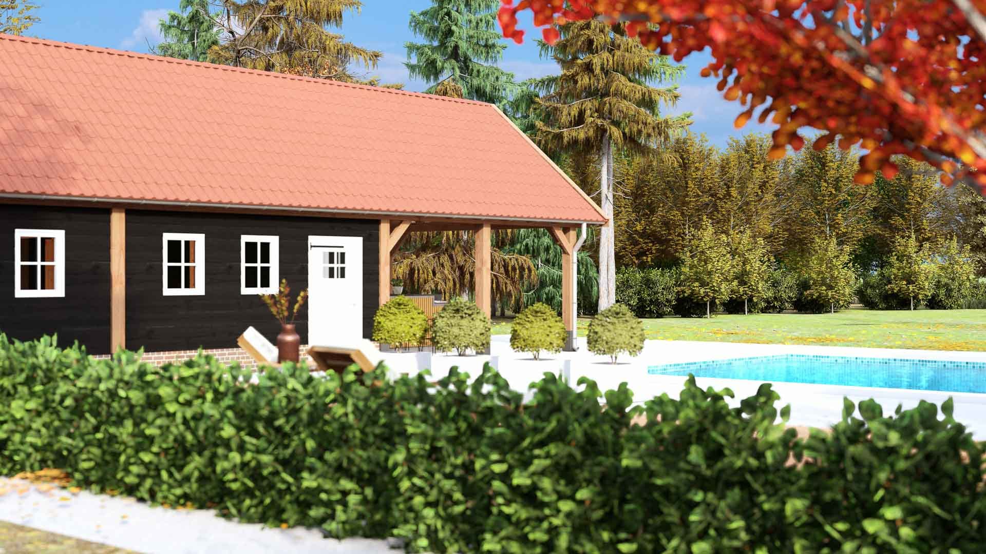 Buitenverblijf Milaan XXL is een stijlvolle dakoplossing uitzonderlijk geschikt voor landelijke omgevingen, zoals boerderijen, landhuizen en huizen in bossen of weilanden, waar het een warme, huiselijke sfeer creëert. Met zijn pen-en-gat- en zwaluwstaartverbindingen biedt dit een klassieke esthetiek. De verdikte ringbalken maken grotere overspanningen mogelijk, waardoor het ook ideaal is voor bijvoorbeeld het stallen van agrarische landbouwmachines of als werkplaats.