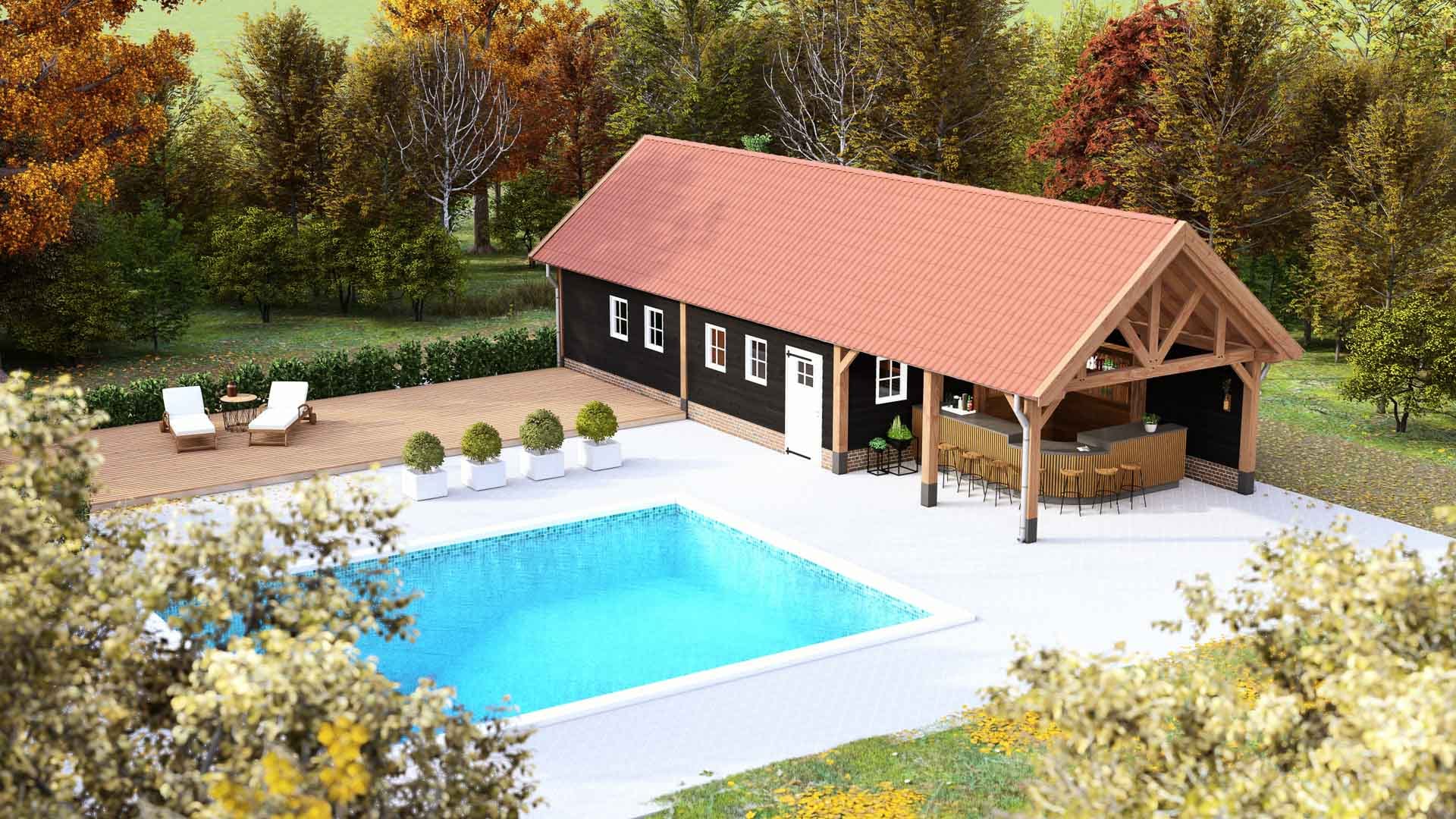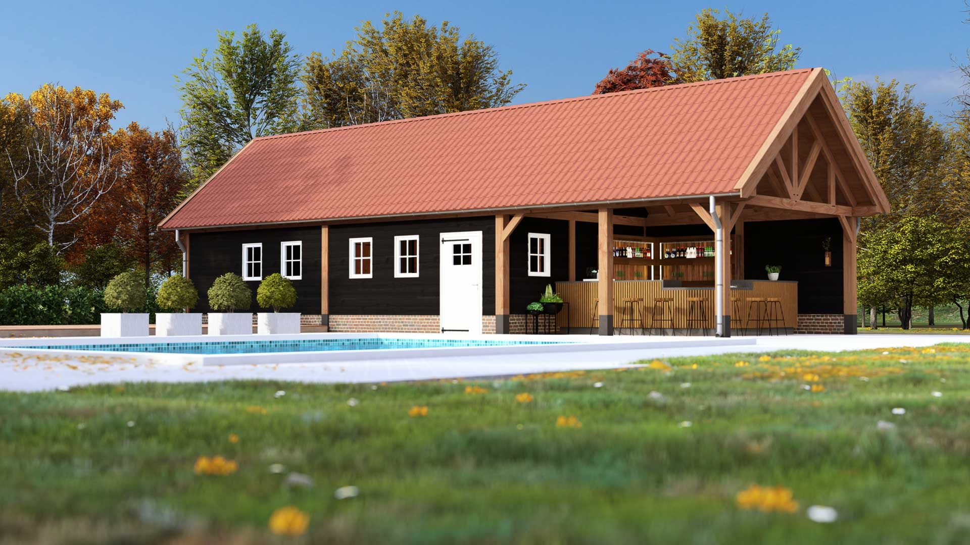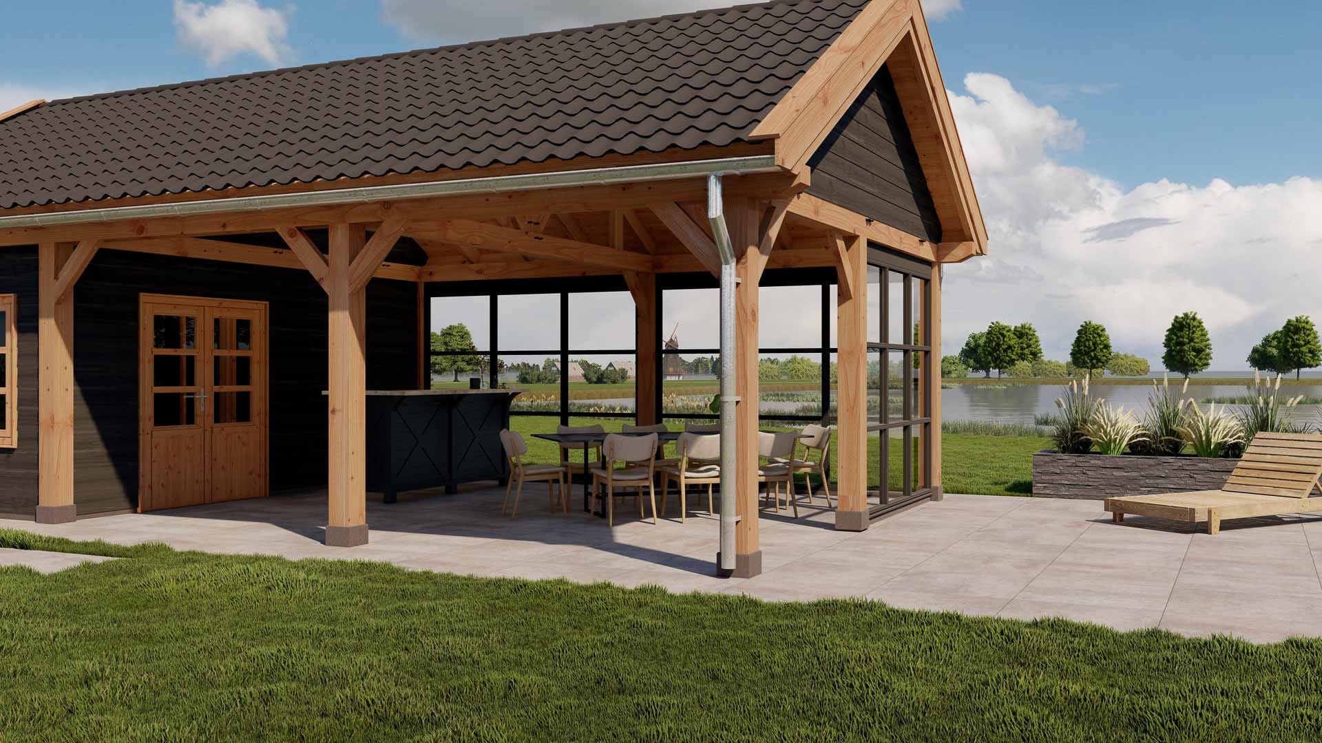 Buitenverblijf Milaan XXL is een stijlvolle dakoplossing uitzonderlijk geschikt voor landelijke omgevingen, zoals boerderijen, landhuizen en huizen in bossen of weilanden, waar het een warme, huiselijke sfeer creëert. Met zijn pen-en-gat- en zwaluwstaartverbindingen biedt dit een klassieke esthetiek. De verdikte ringbalken maken grotere overspanningen mogelijk, waardoor het ook ideaal is voor bijvoorbeeld het stallen van agrarische landbouwmachines of als werkplaats.