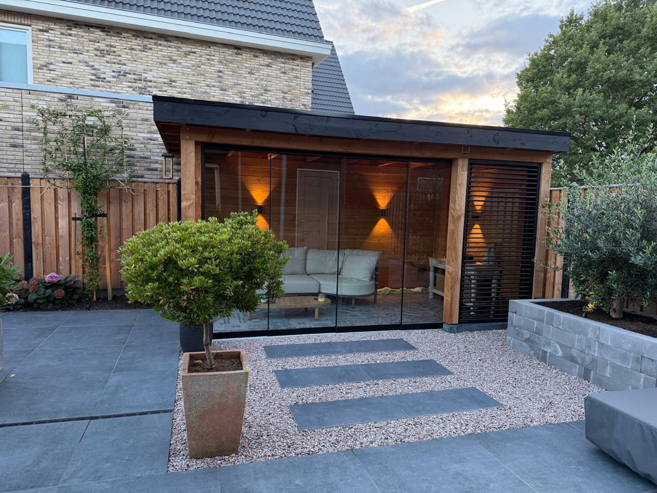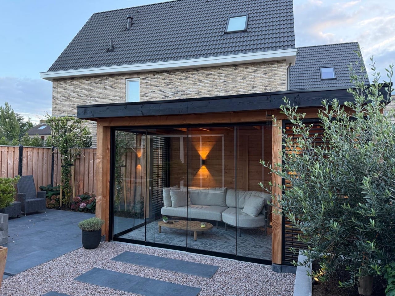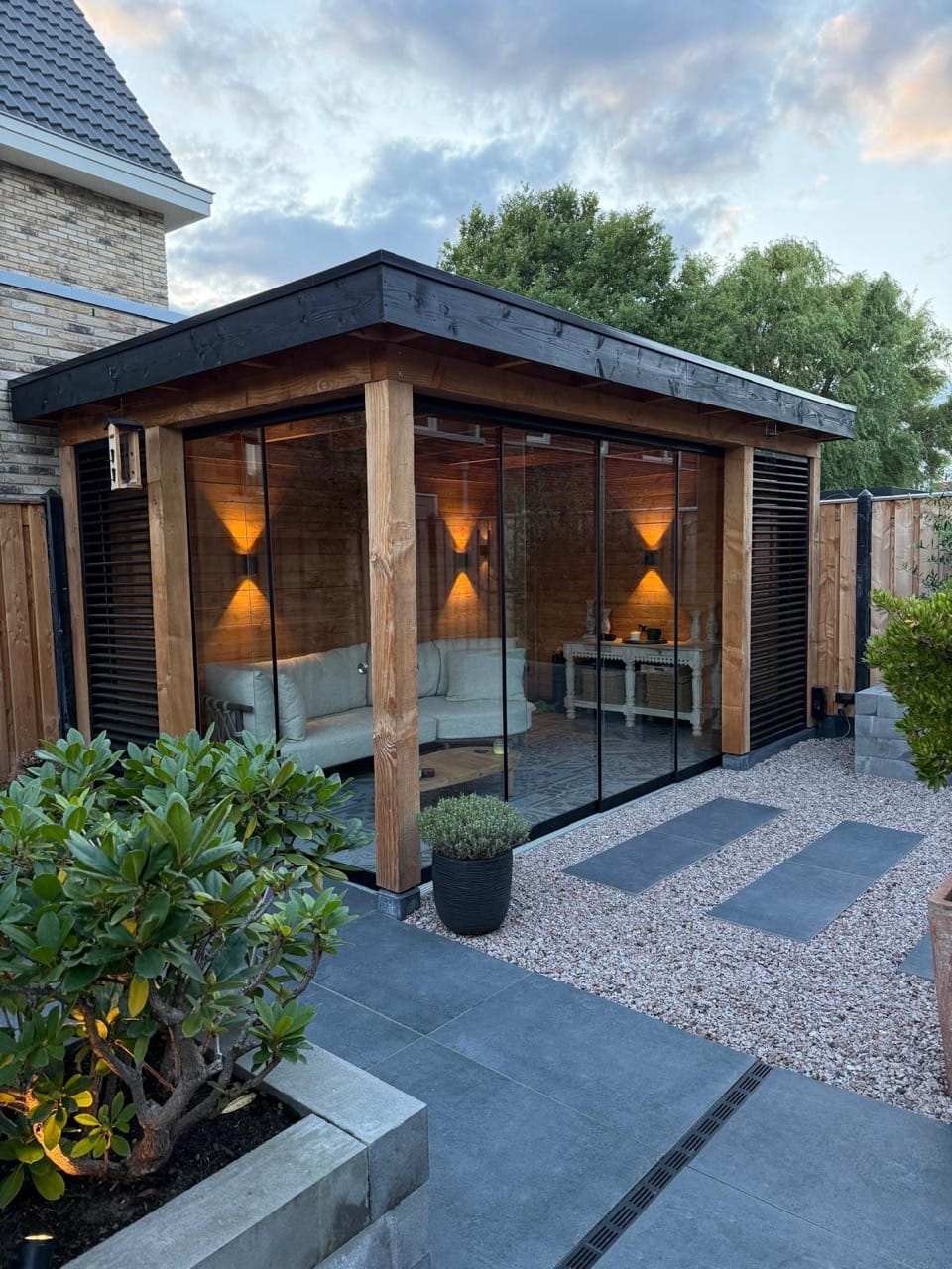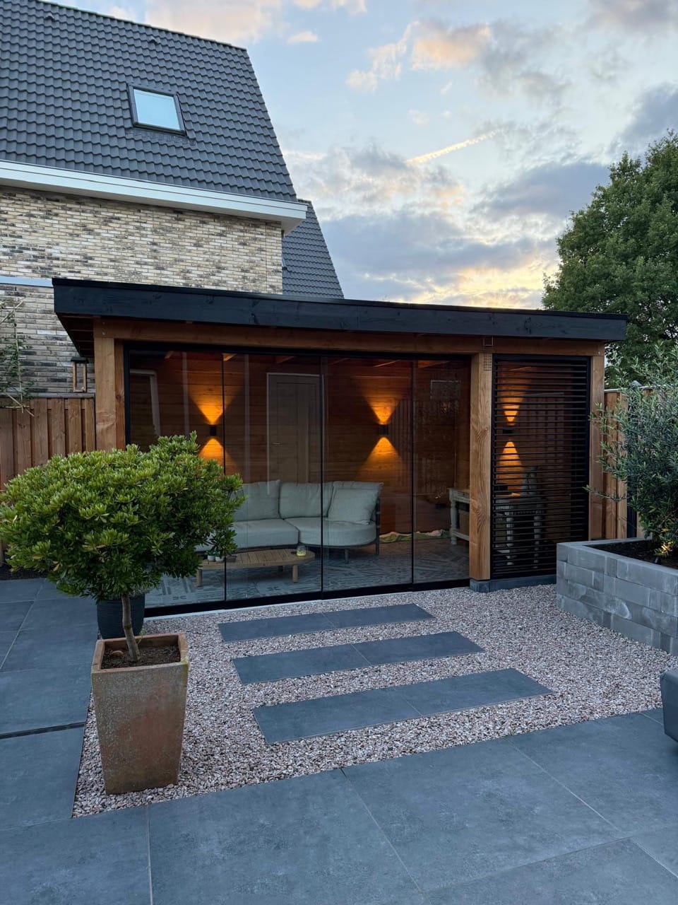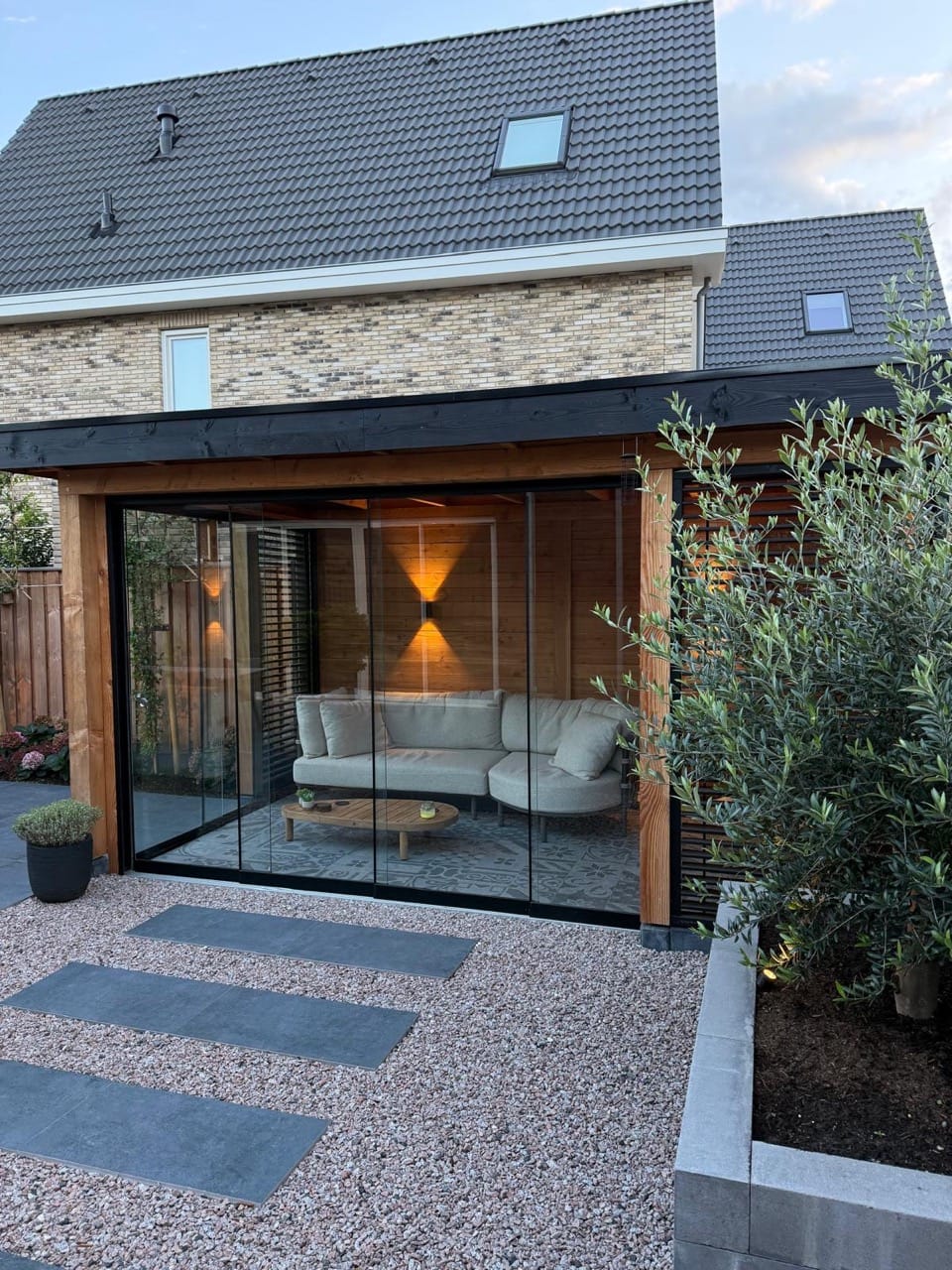 In dit project is gekozen voor een luxe douglas overkapping, volledig afgesloten met glazen schuifwanden. Dit zorgt voor een stijlvol geheel dat perfect aansluit bij de moderne tuin. Dankzij de up-down wandlampen ontstaat er ’s avonds een sfeervolle ambiance, waardoor de overkapping zowel overdag als in de avond een heerlijke plek is om te ontspannen. De combinatie van warme houttinten, zwart accentwerk en de glazen wanden maakt dit een echte eyecatcher in de tuin.