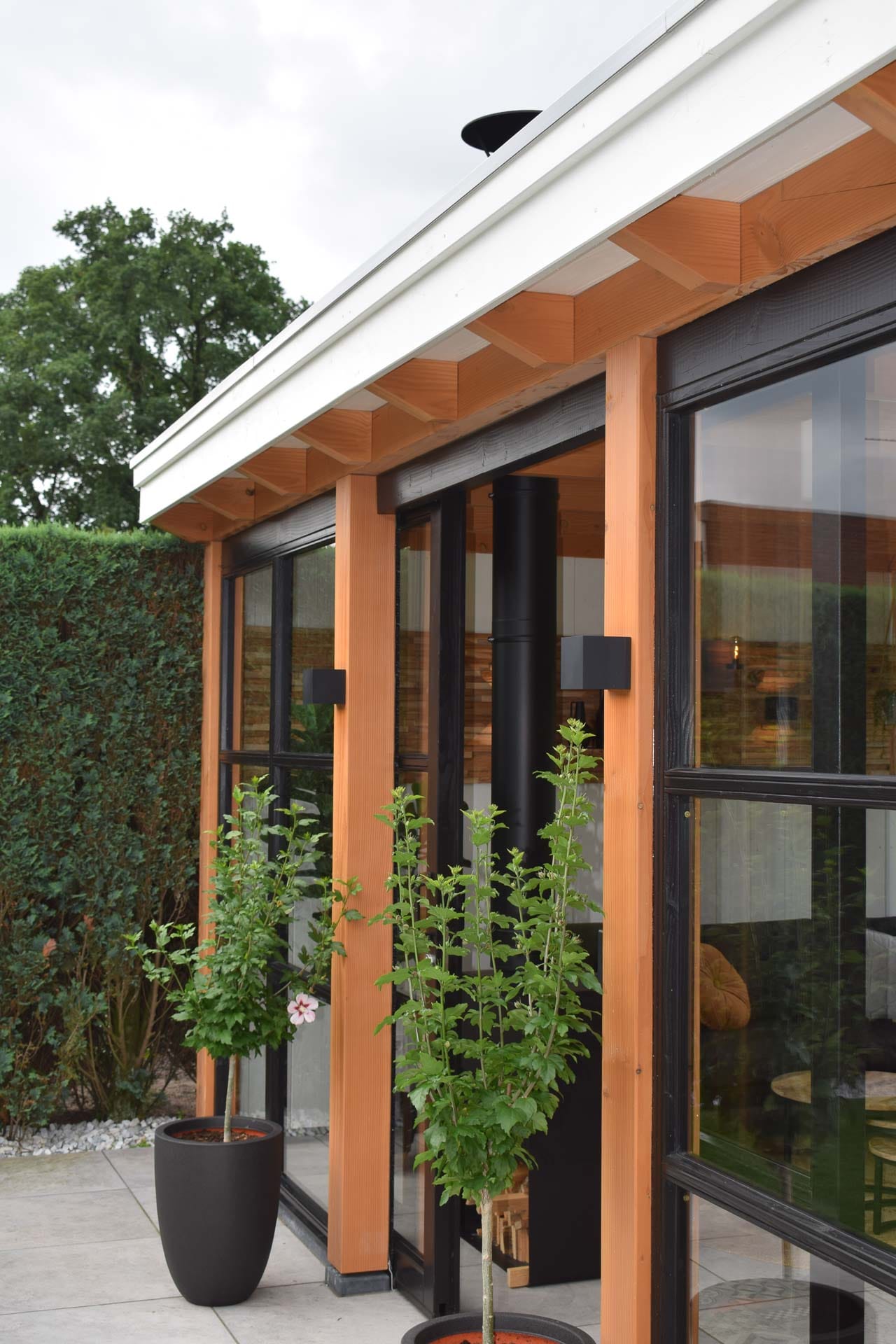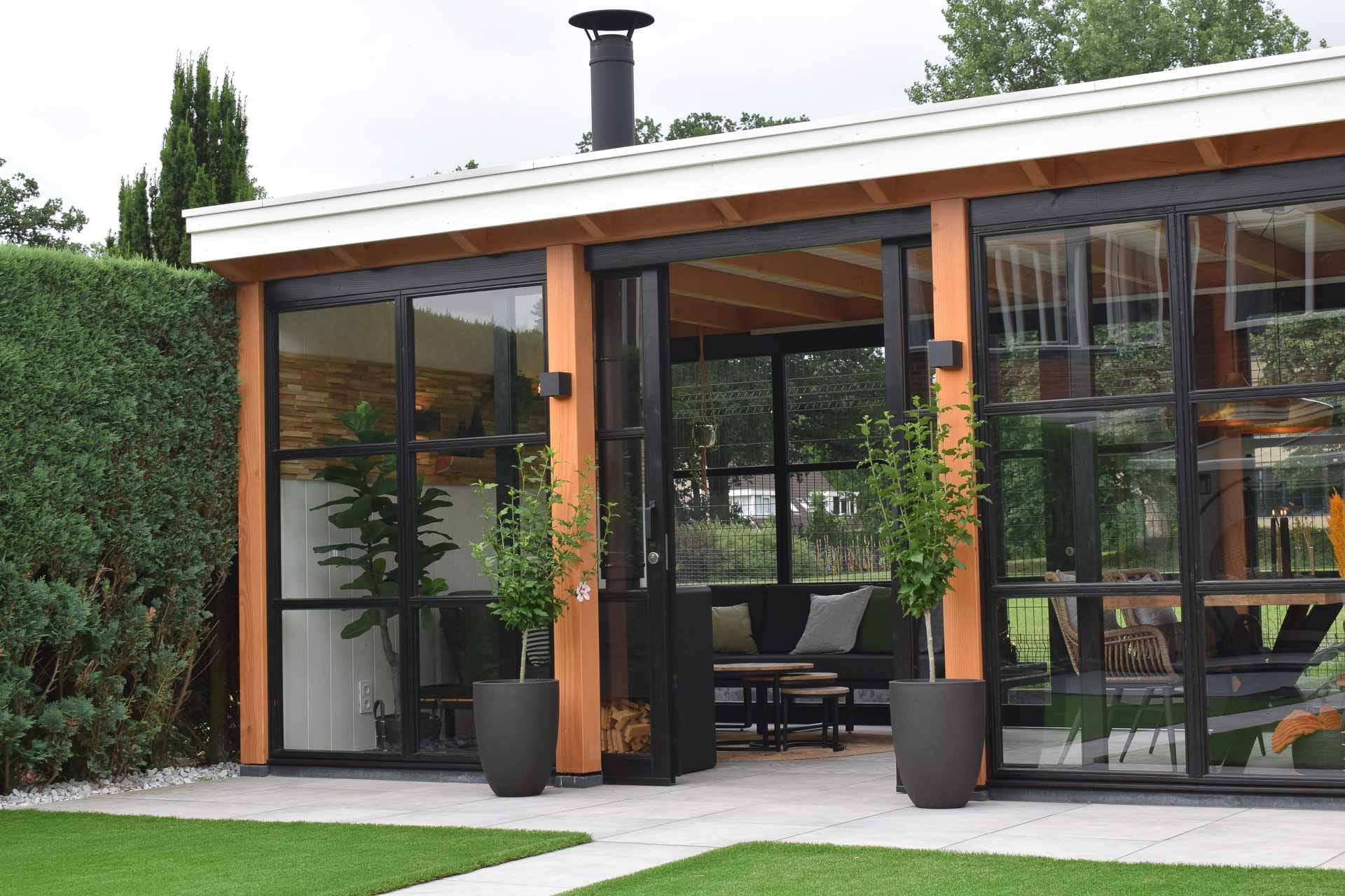 Een moderne douglas overkapping met glazen wanden en berging, volledig op maat gemaakt. Stijlvol, duurzaam en perfect voor elk seizoen. Plan nu een vrijblijvende afspraak!