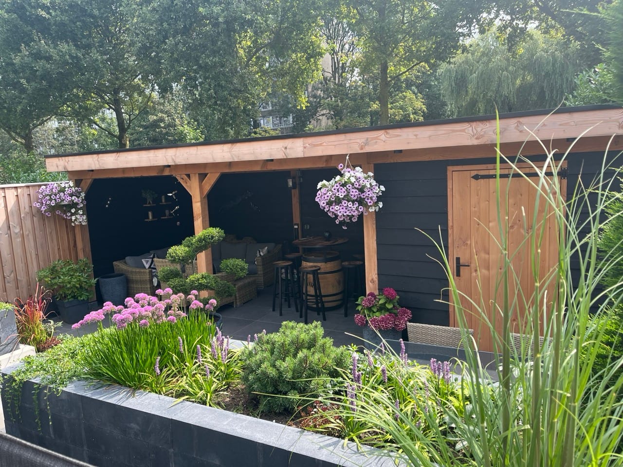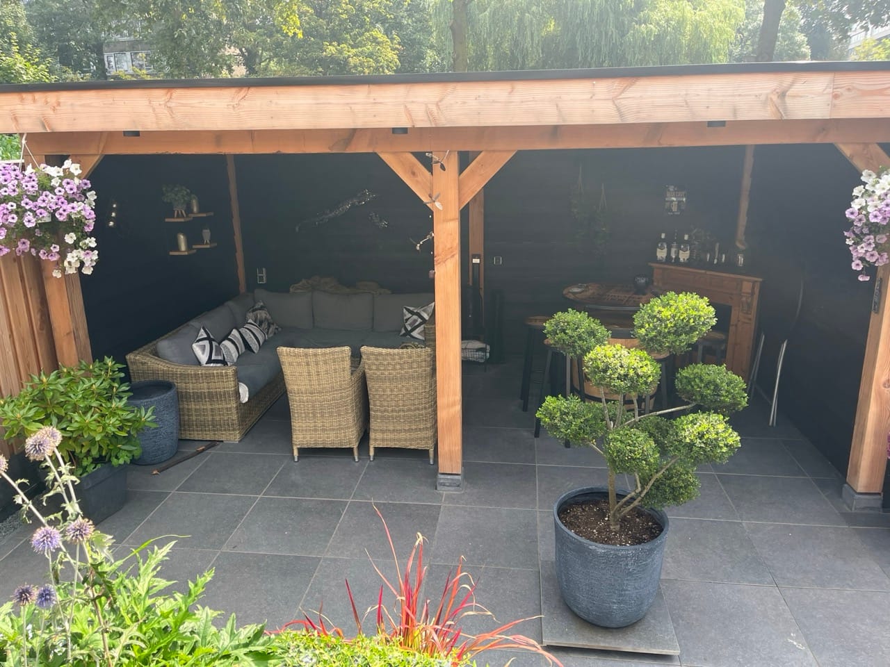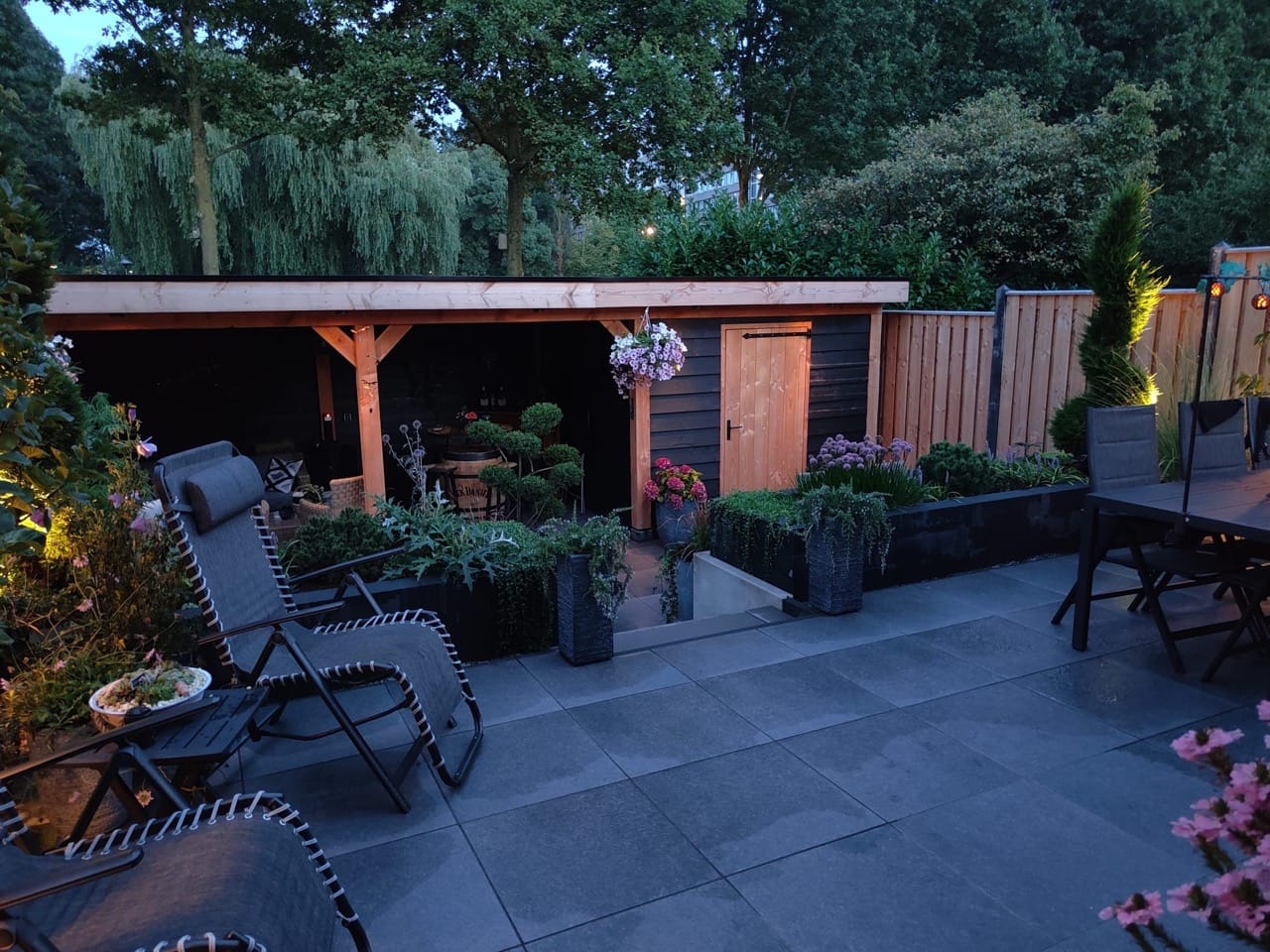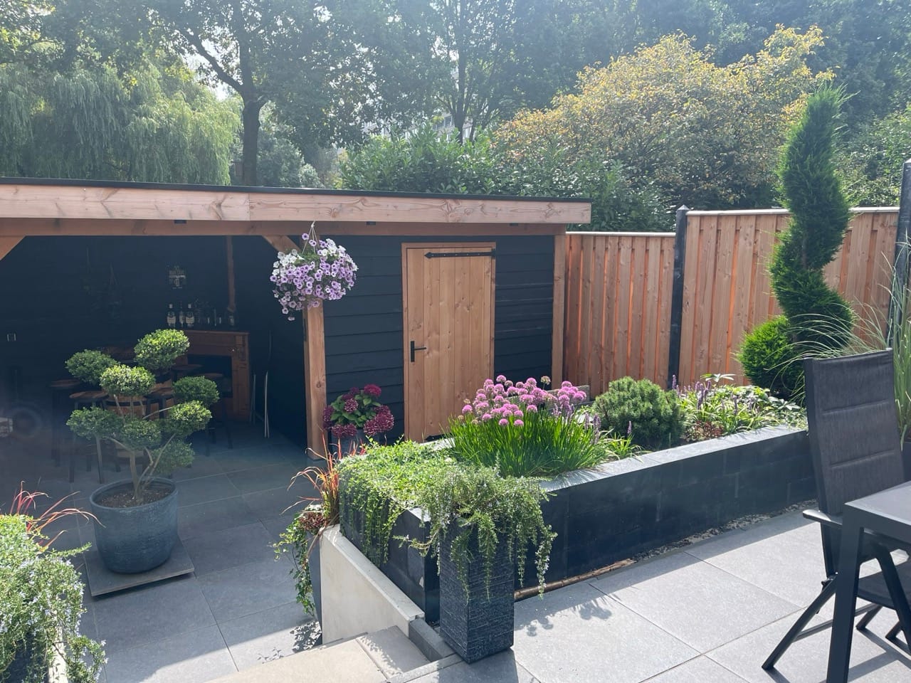 In deze tuin creëerden we een speelse indeling met een trap door het hoogteverschil. Achterin staat een robuuste douglas overkapping met zwarte achterwand, perfect voor lounge of bar. Ook uw tuin transformeren? Maak vrijblijvend een afspraak en ontdek de mogelijkheden.