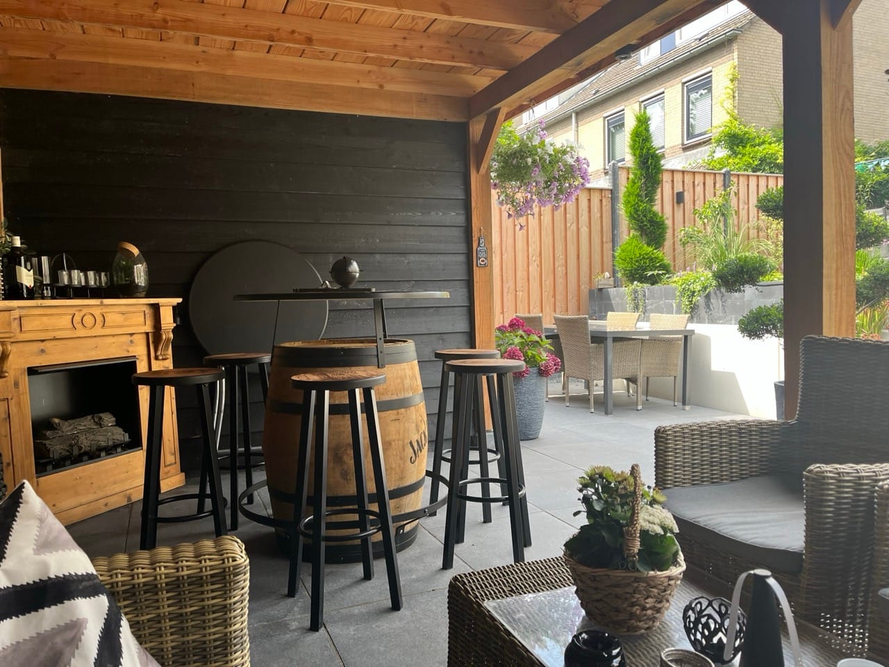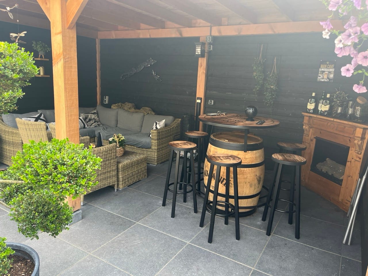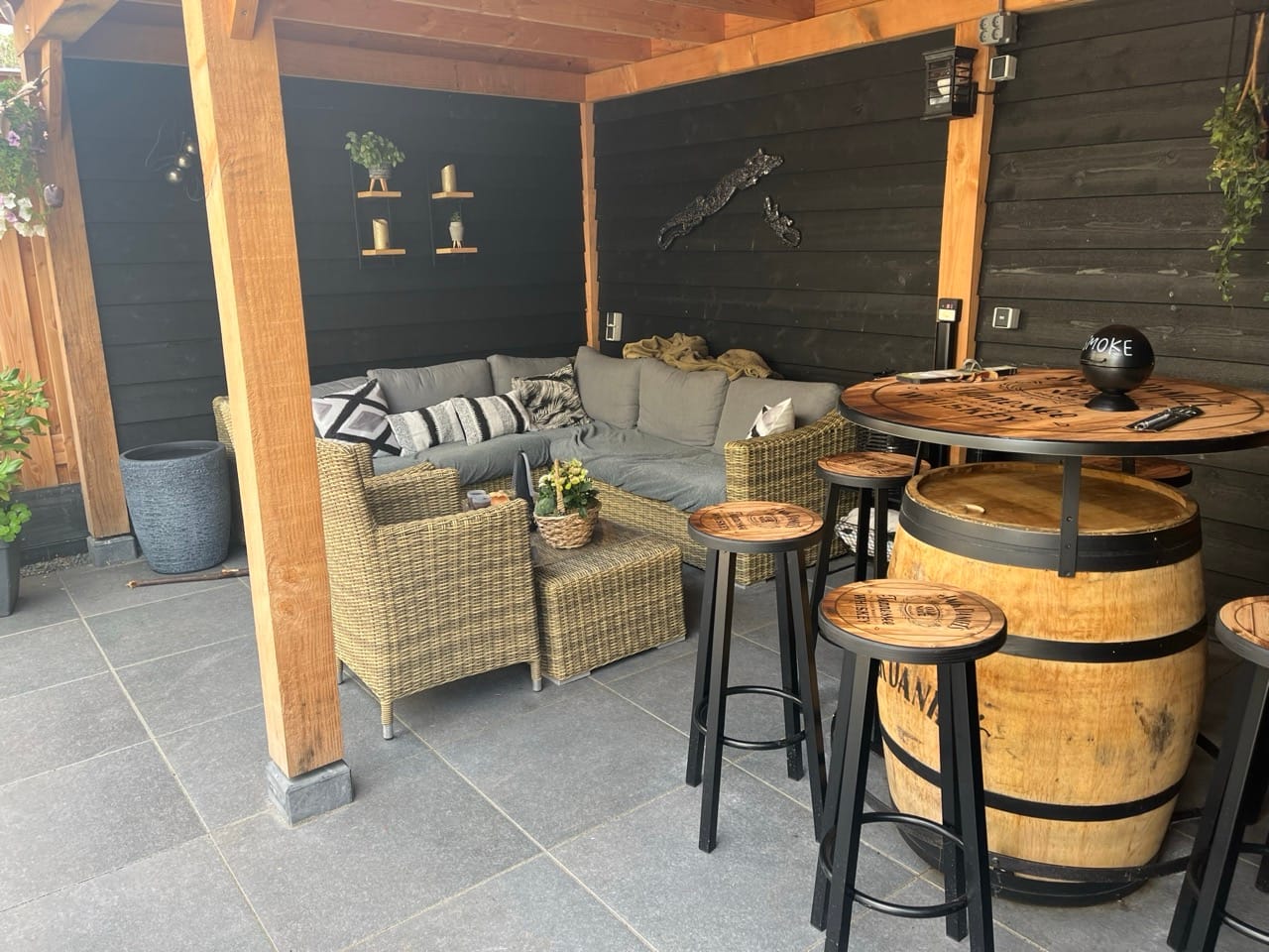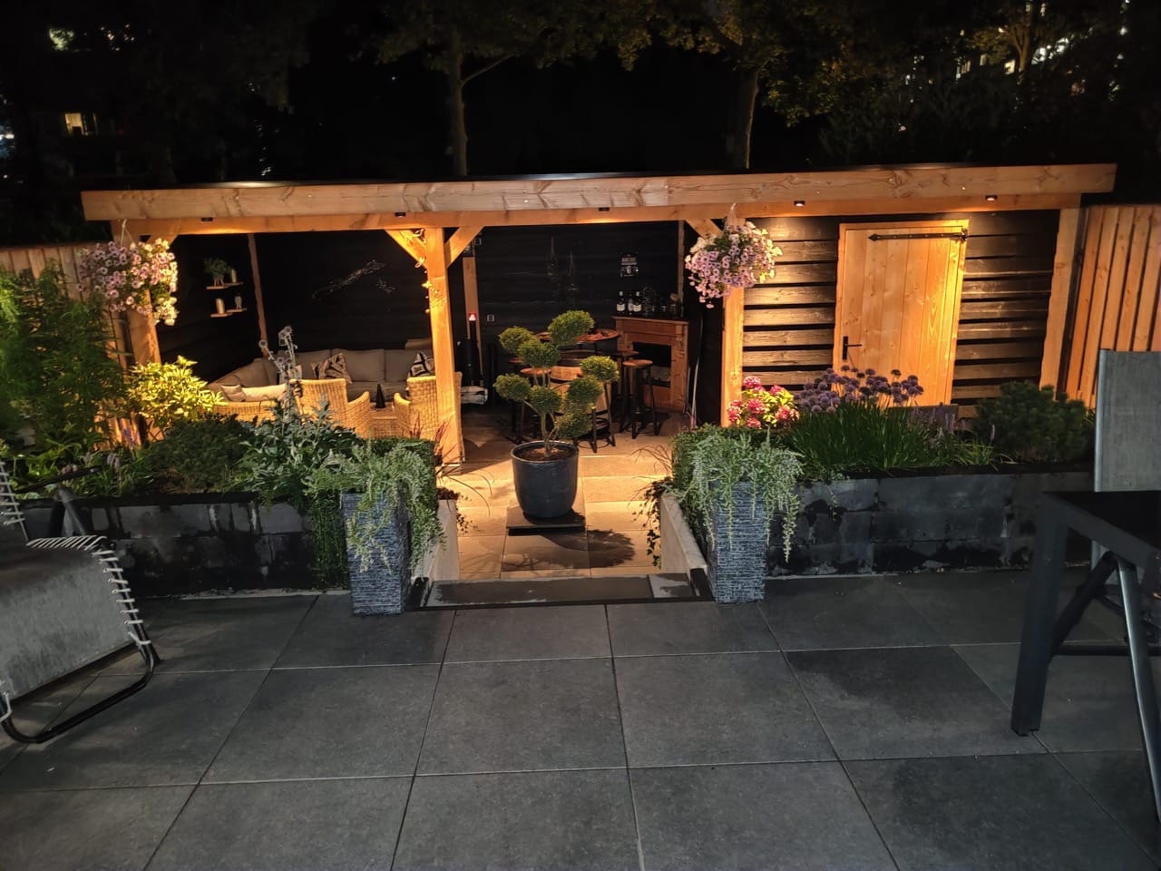 In deze tuin creëerden we een speelse indeling met een trap door het hoogteverschil. Achterin staat een robuuste douglas overkapping met zwarte achterwand, perfect voor lounge of bar. Ook uw tuin transformeren? Maak vrijblijvend een afspraak en ontdek de mogelijkheden.