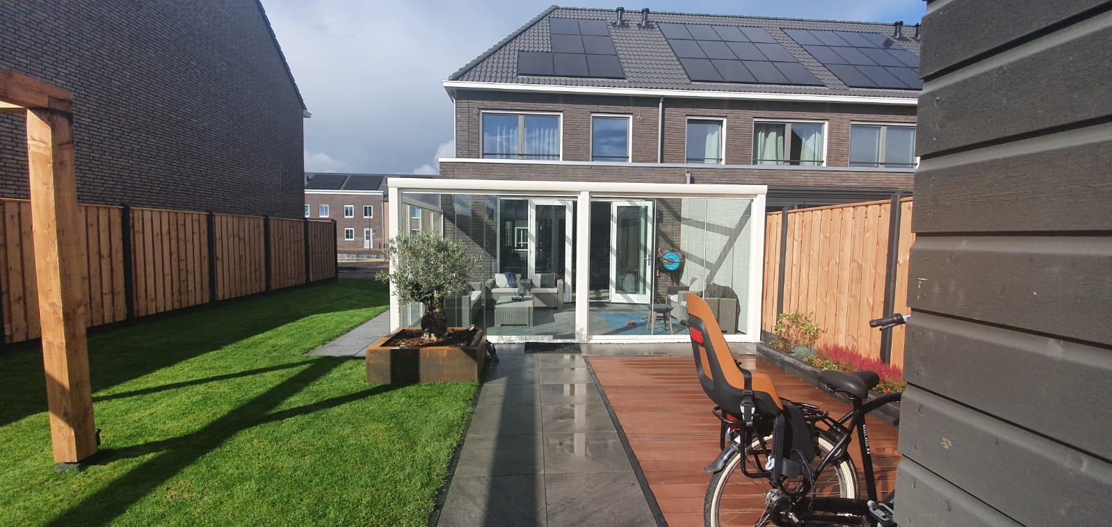 Deze strakke aluminium overkapping in wit, voorzien van glazen schuifwanden, vormt een lichte en moderne uitbreiding van de woning. Een plek om het hele jaar door comfortabel buiten te leven. Ook zo’n stijlvolle overkapping? Plan vrijblijvend een afspraak en ontdek de mogelijkheden.