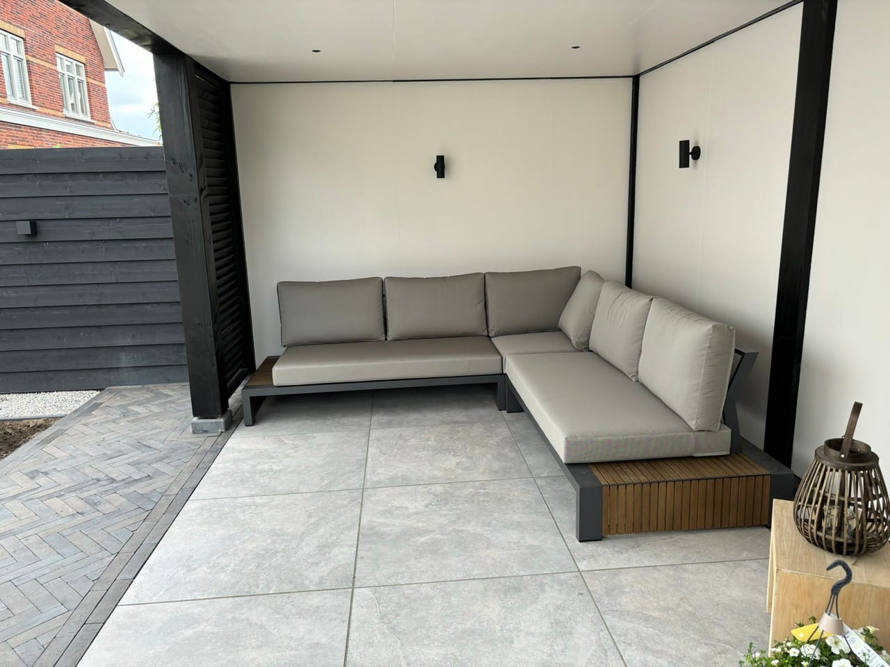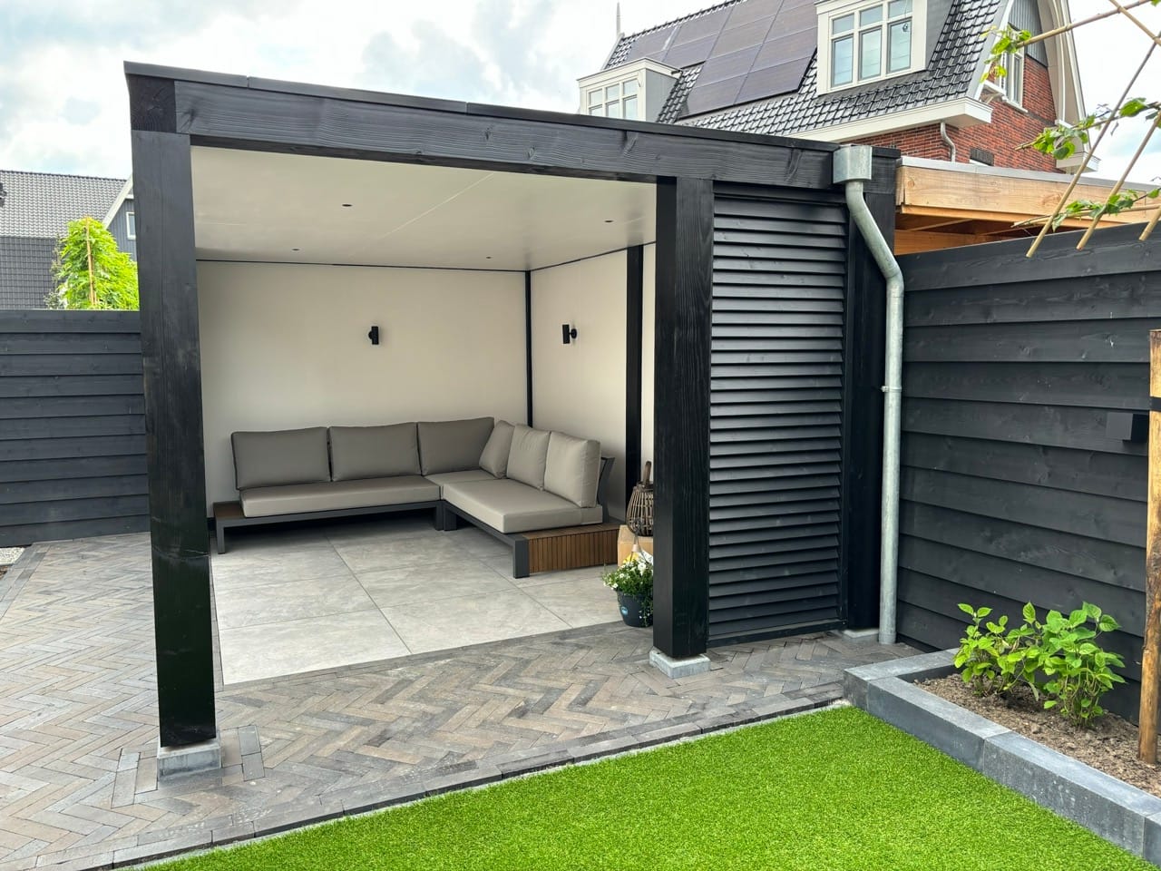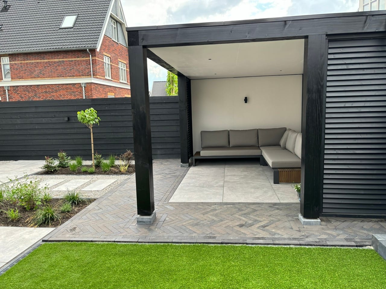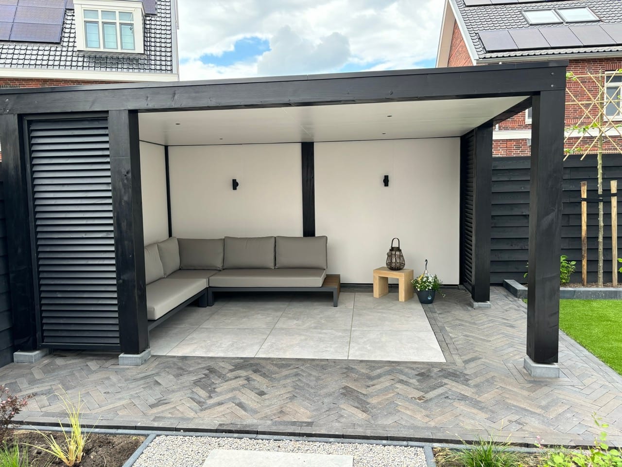 In deze moderne tuin is een Douglas overkapping geplaatst met een strak zwart-wit ontwerp. De zwarte buitenzijde met shutters combineert perfect met de witte binnenkant, wat zorgt voor een luxe uitstraling. De tuin is aangelegd met grote tegels, visgraat klinkers, siergrind en strakke borders met siergrassen en jonge bomen. Een stijlvolle combinatie van modern design en groen.